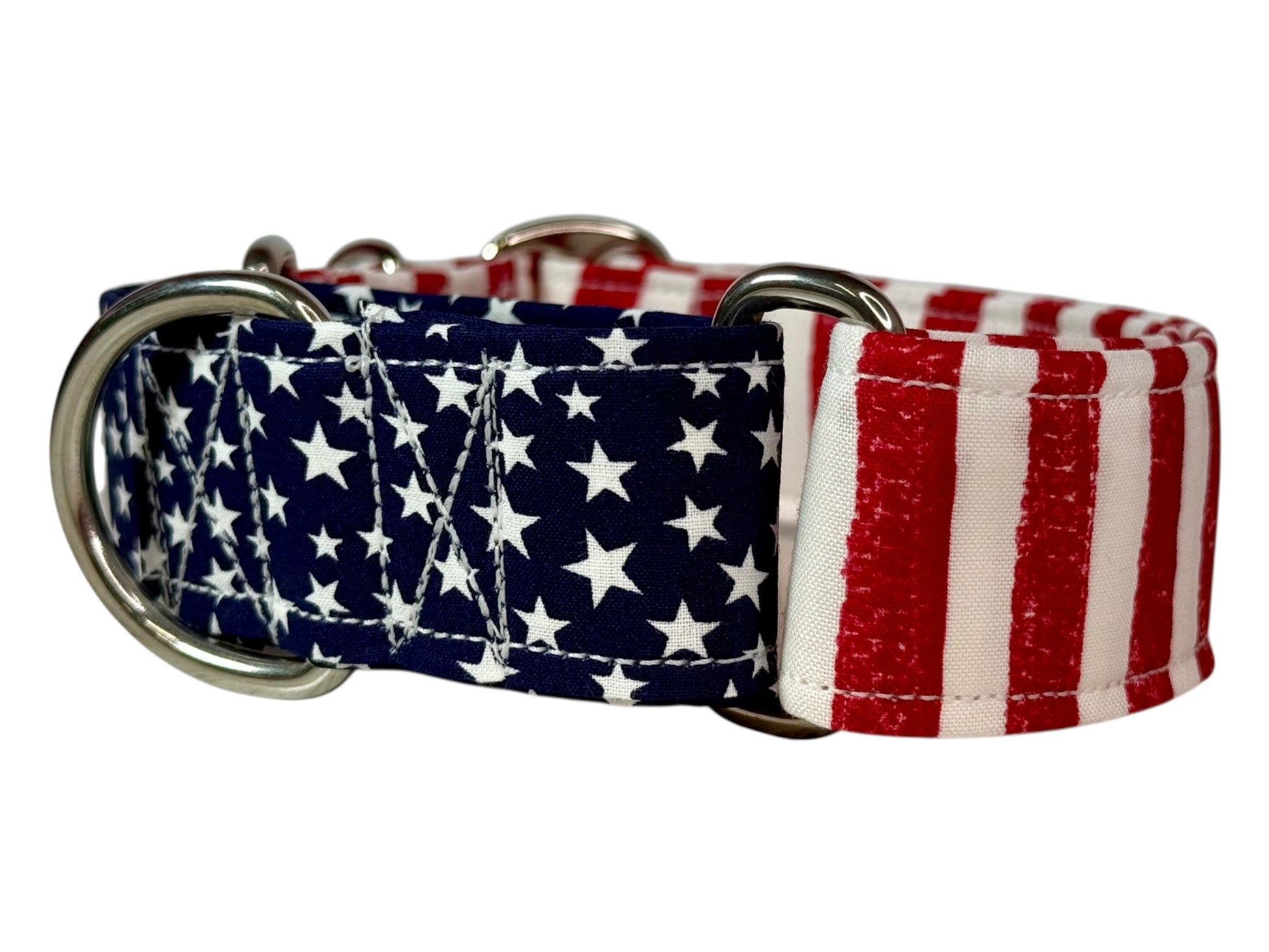 Enhance your dog's training with the Stars and Stripes martingale dog collar. This gentle choke collar features a patriotic design, ensuring your furry friend looks stylish while learning proper leash behavior. No buckle for easy on and off.