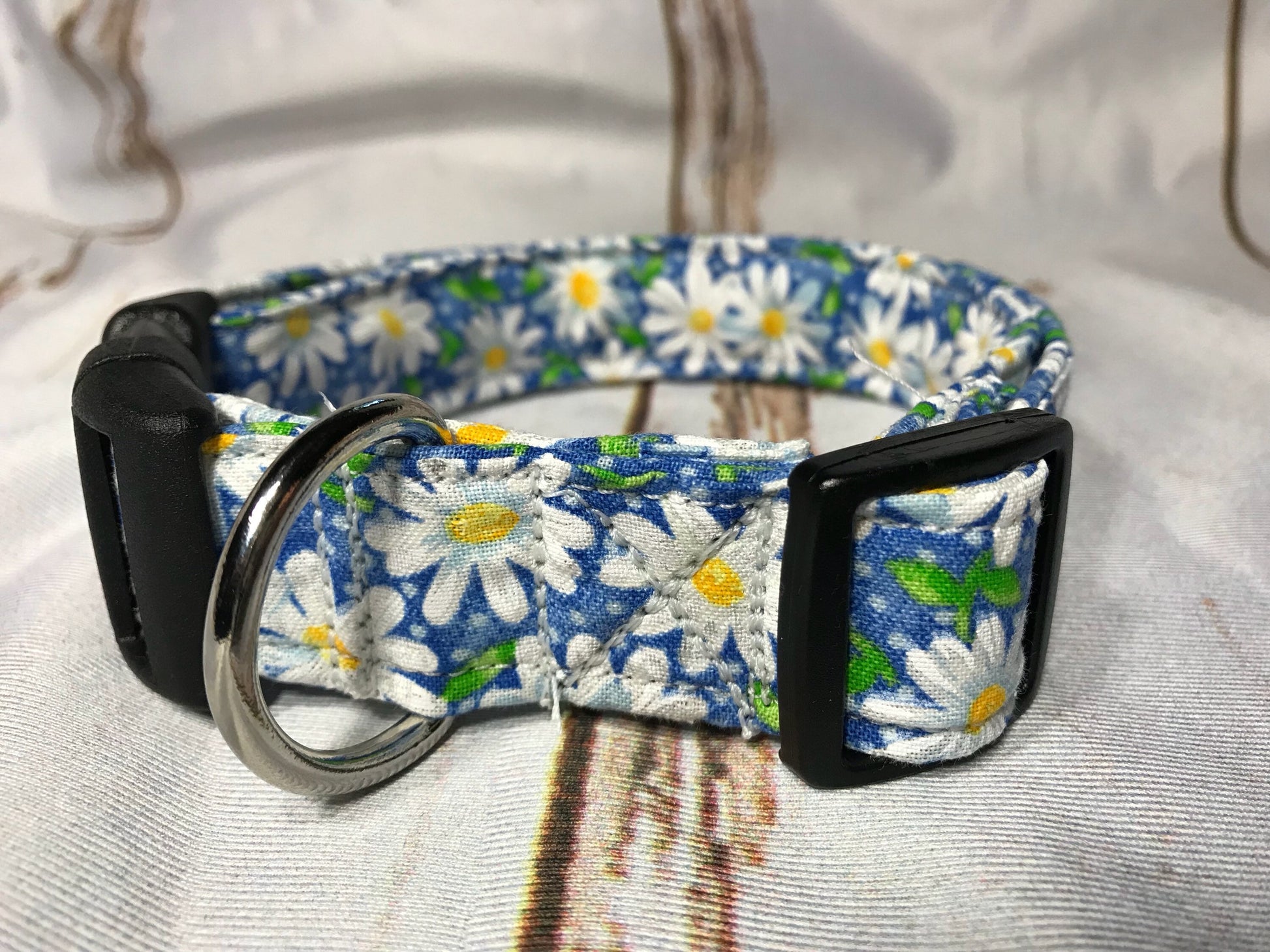 Blue daisy dog collar, floral dog collar, dog collar girl, adjustable, washable, side release, fabric dog collar, eco friendly, daisy, blue