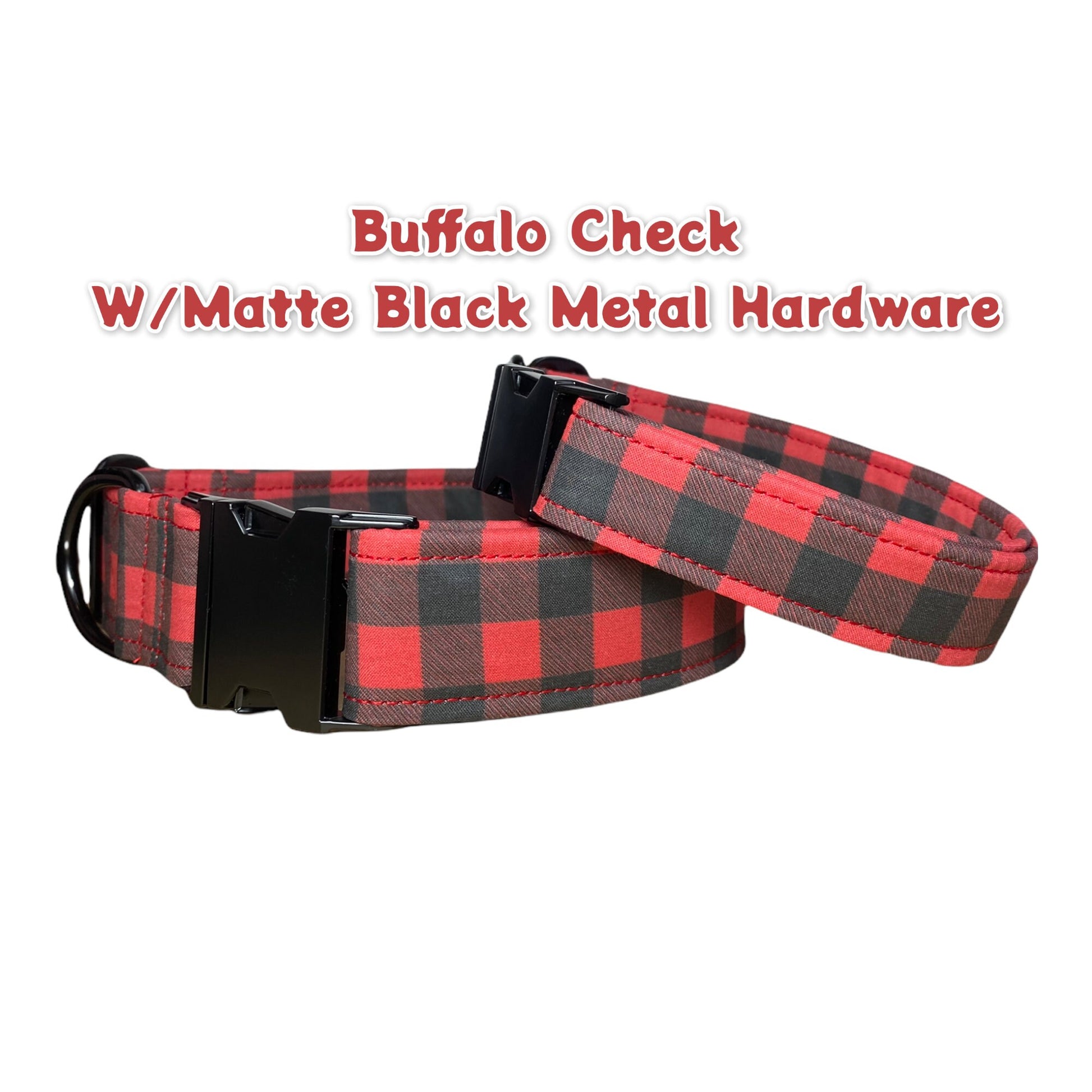 Buffalo Check Dog collar, buffalo plaid, metal hardware, adjustable dog collar, dog collar, side release collar, matte black, red, black