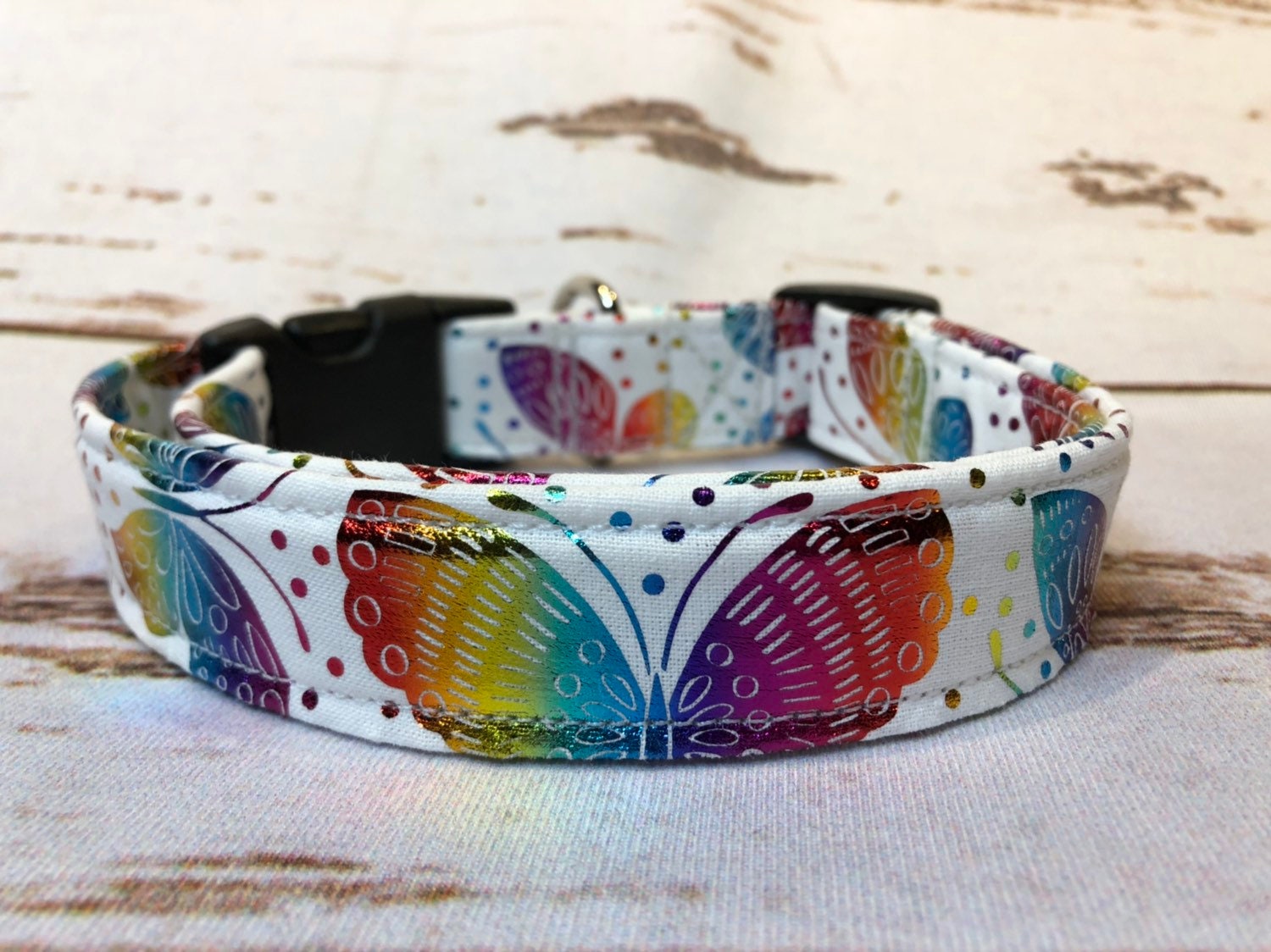 Butterfly dog collar, rainbow foil butterflies, side release dog collar, adjustable collar, fabric dog collar, white, butterflies, washable