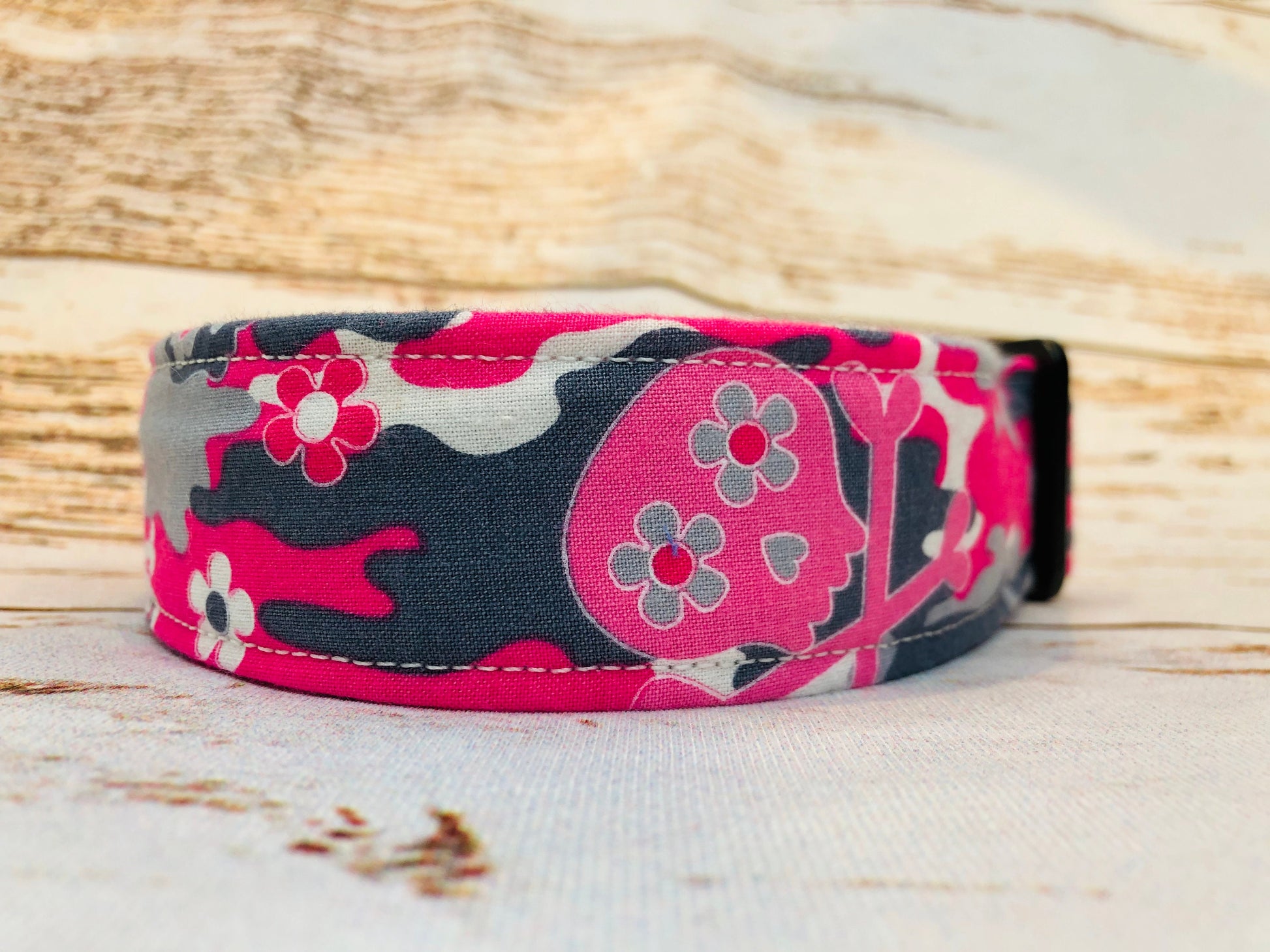 Camouflage and skulls dog collar, girl dog collar, pink dog collar, adjustable collar, washable, side release collar, camouflage, skulls