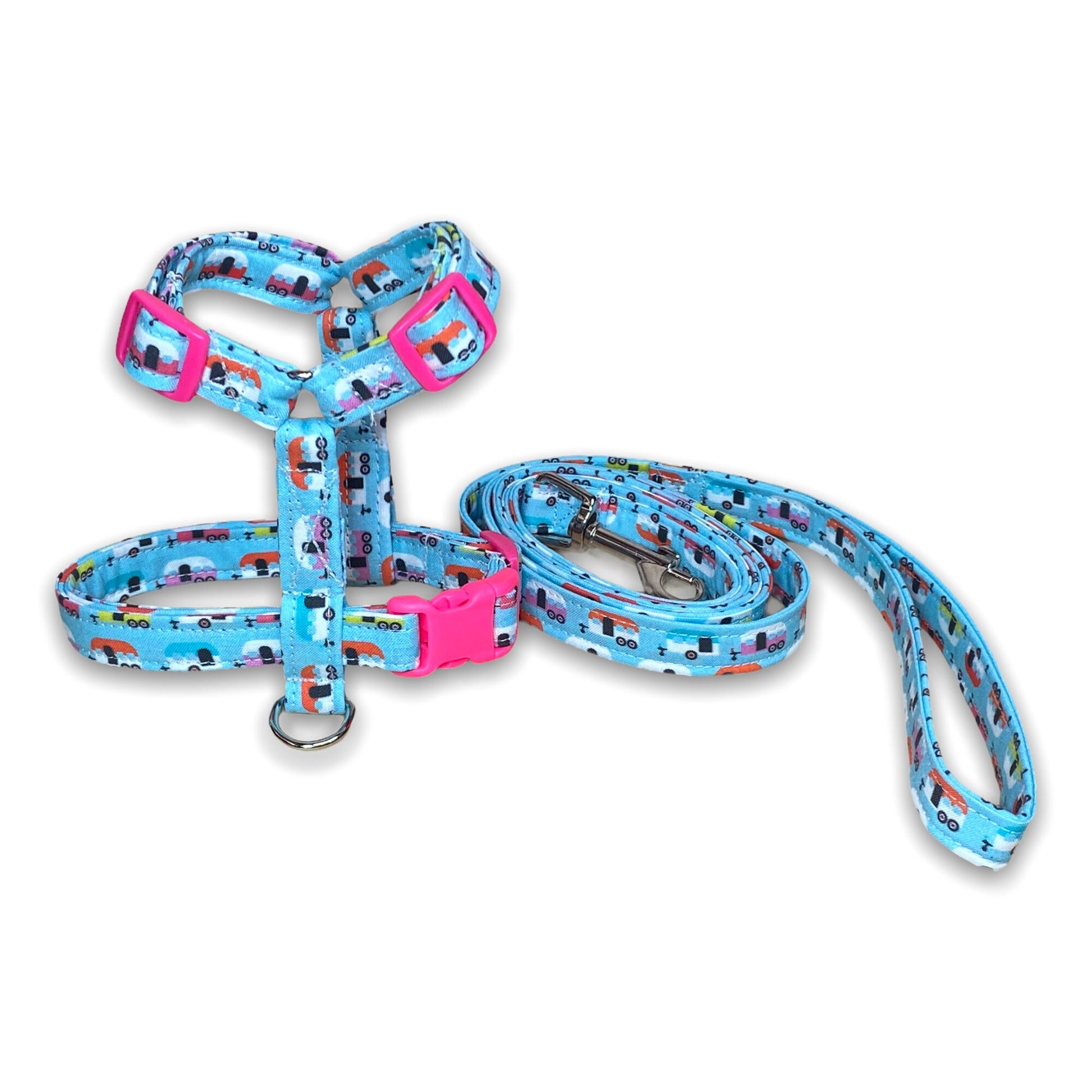 Camper dog harness and leash set, step in dog harness, standard Roman harness, tiny campers, adjustable dog harness, fabric dog harness
