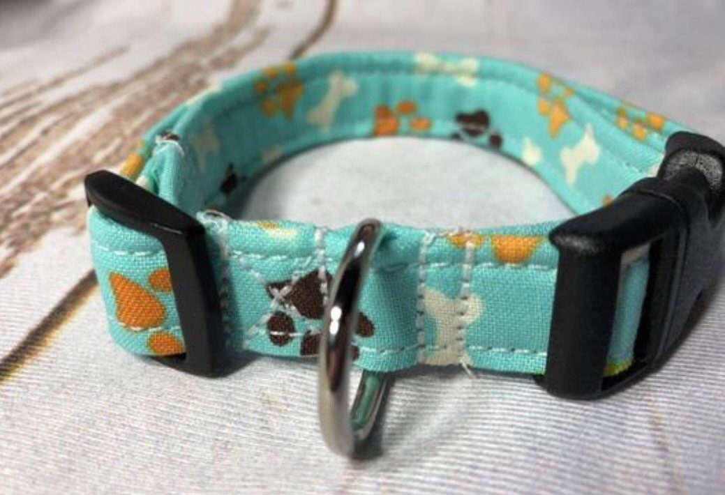 Dog Collar, teal dog collar, martingale collar, adjustable collar, strong dog collar, buckle dog collar, dog collar boy, bones, paws, teal