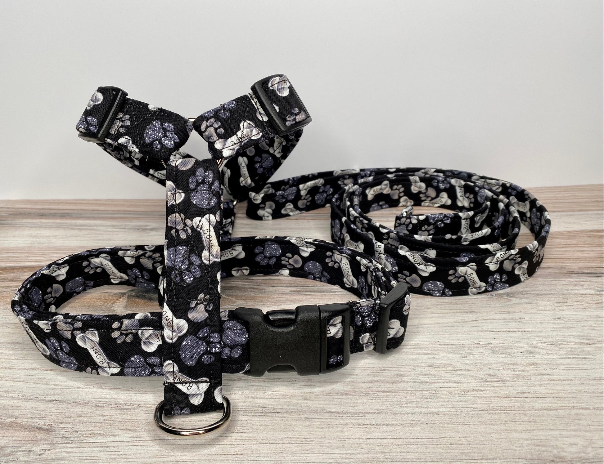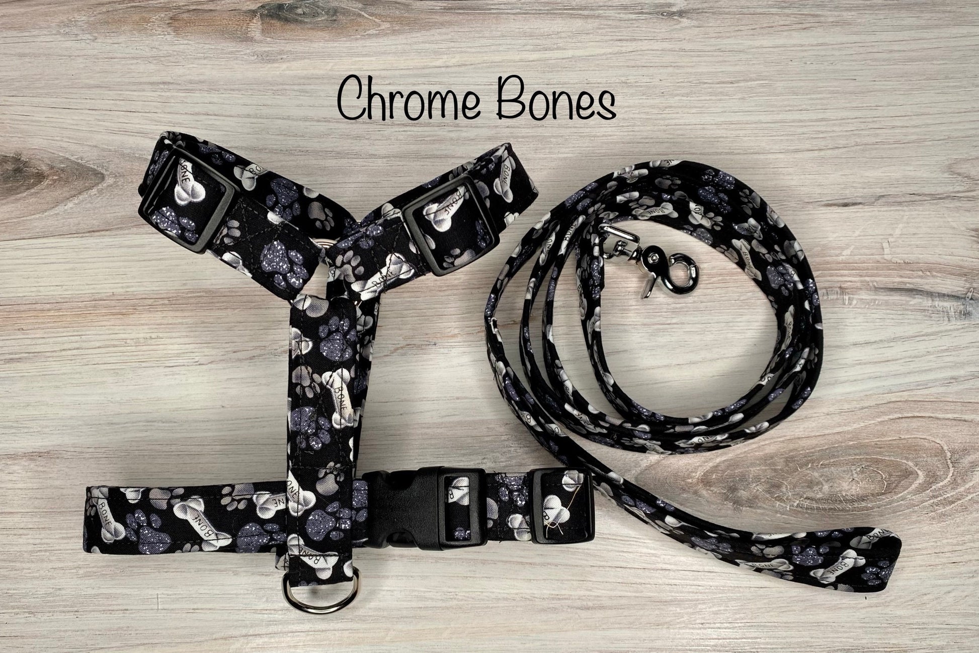 Chrome bone dog harness and leash set, standard roman dog harness, step in dog harness, handmade dog harness, matching leash, black bone print