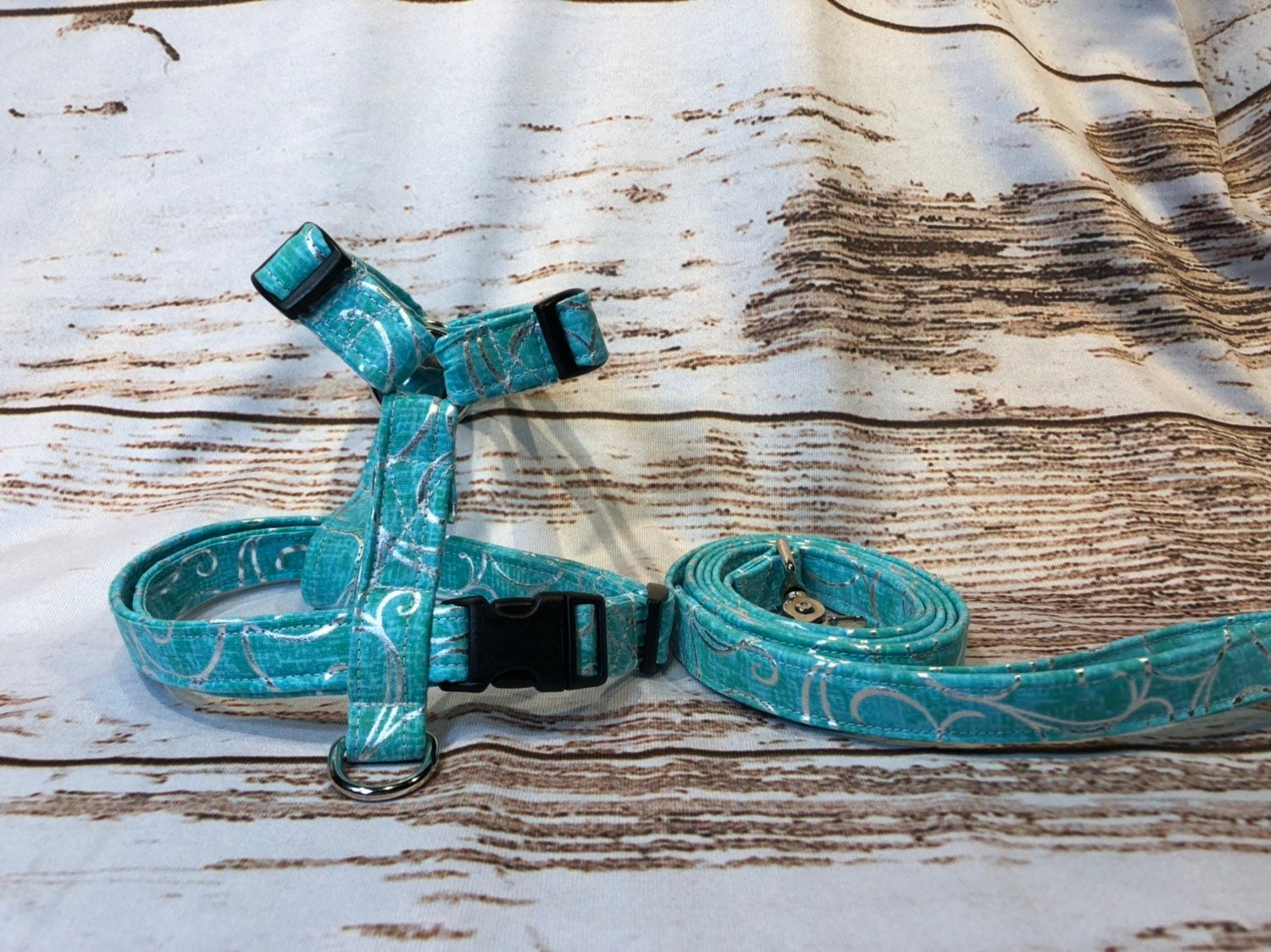 Dog harness, Harness and leash, step in harness, standard harness, adjustable harness, blue dog harness, blue, green silver, swirl