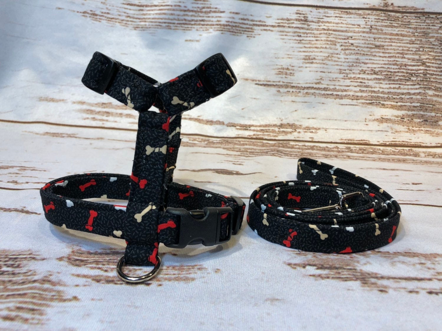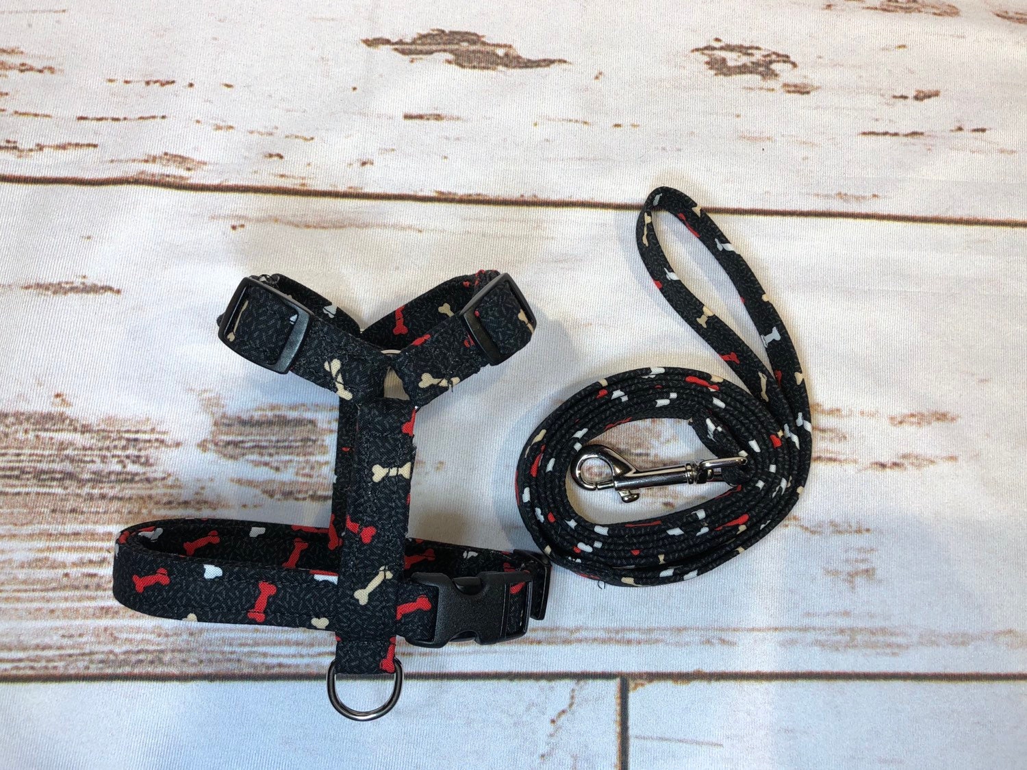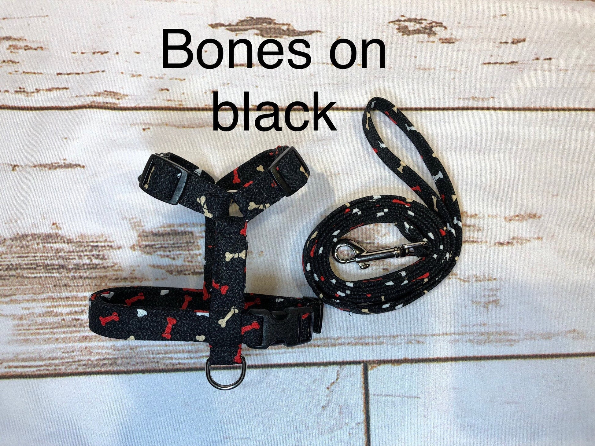 Dog harness, Harness and leash, step in harness, standard harness, adjustable harness, leash, boy dog harness, bones on black, bone print