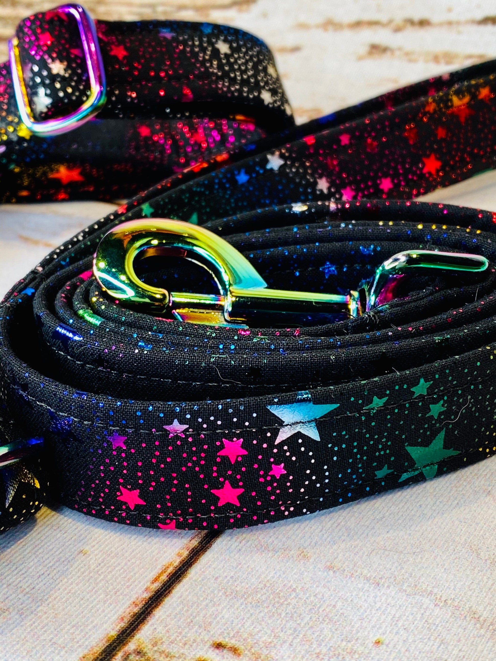 Dog harness, Harness and leash, step in harness, standard harness, dog harness set, Neo chrome hardware, celebration stars, rainbow hardware