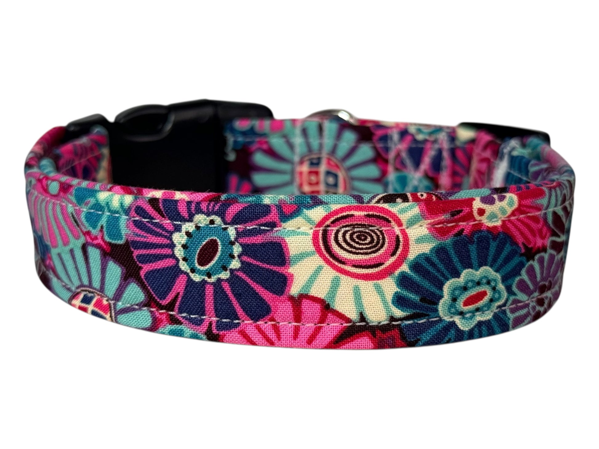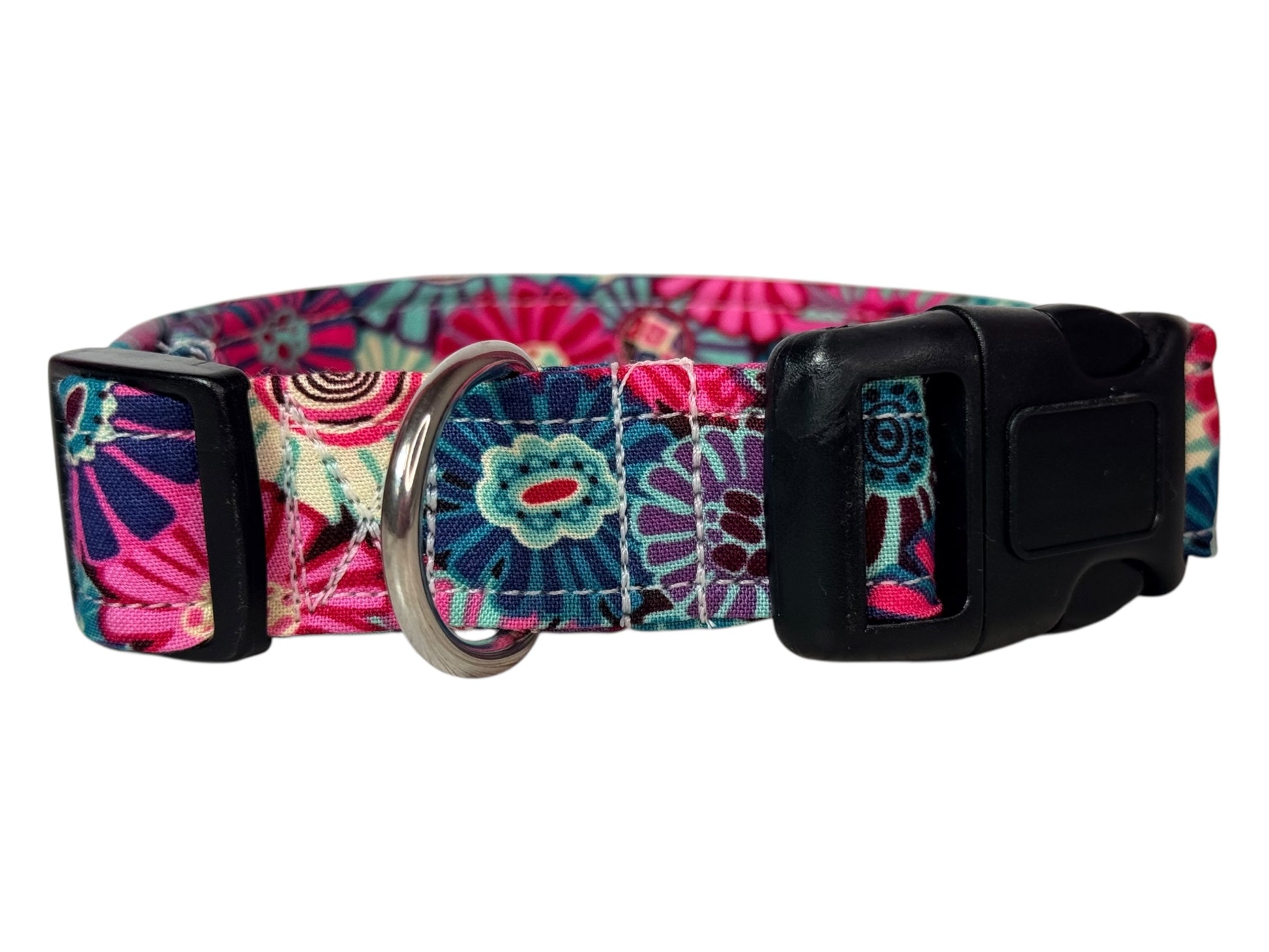 Floral Dog collar, Pink, teal and blue, Handmade dog collar, Handmade Pet Collar with Heavy-Duty Webbing & Stainless Steel Hardware