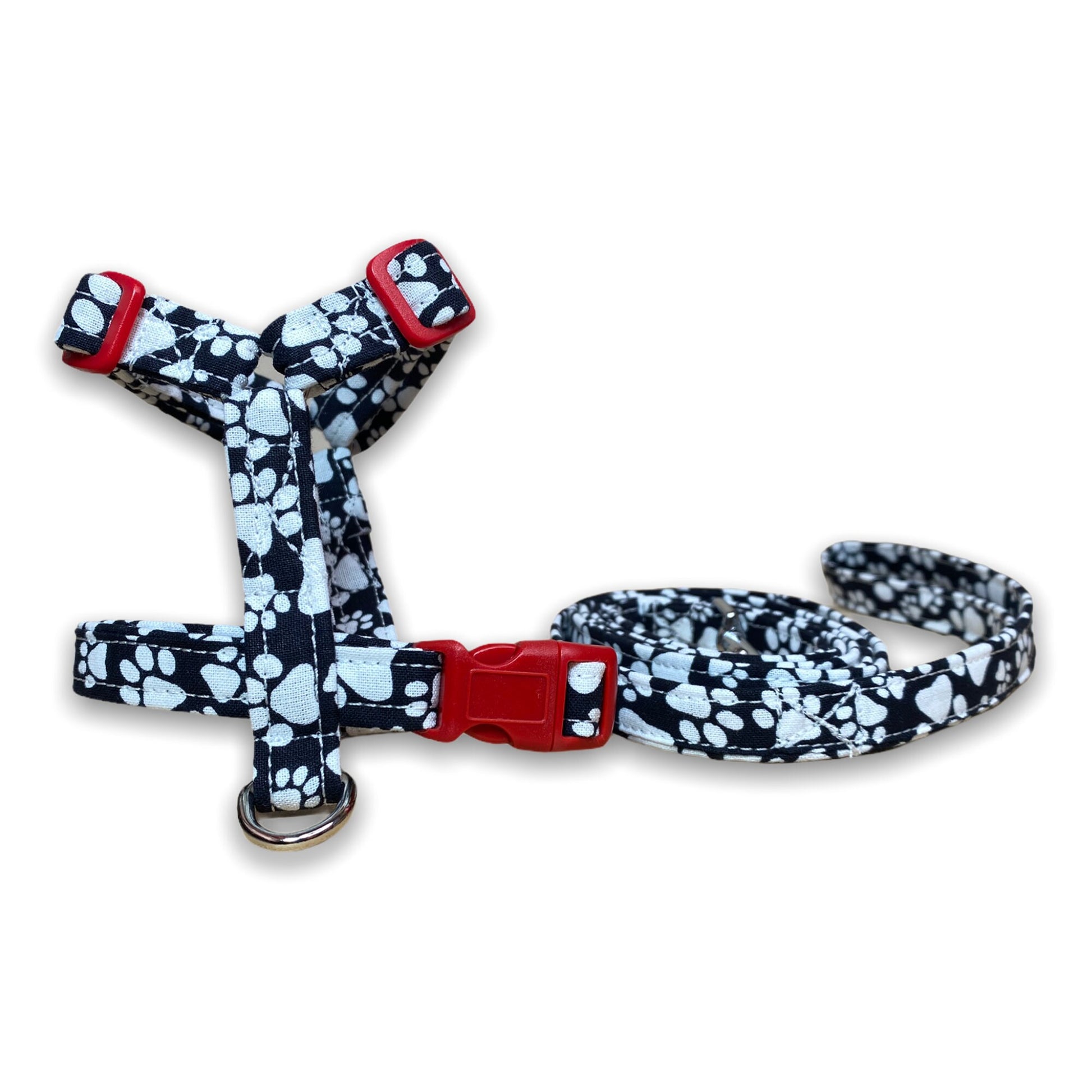 Paw dog harness and leash set, standard Roman harness, step in harness, adjustable dog harness, washable, black, white, paws, matching leash