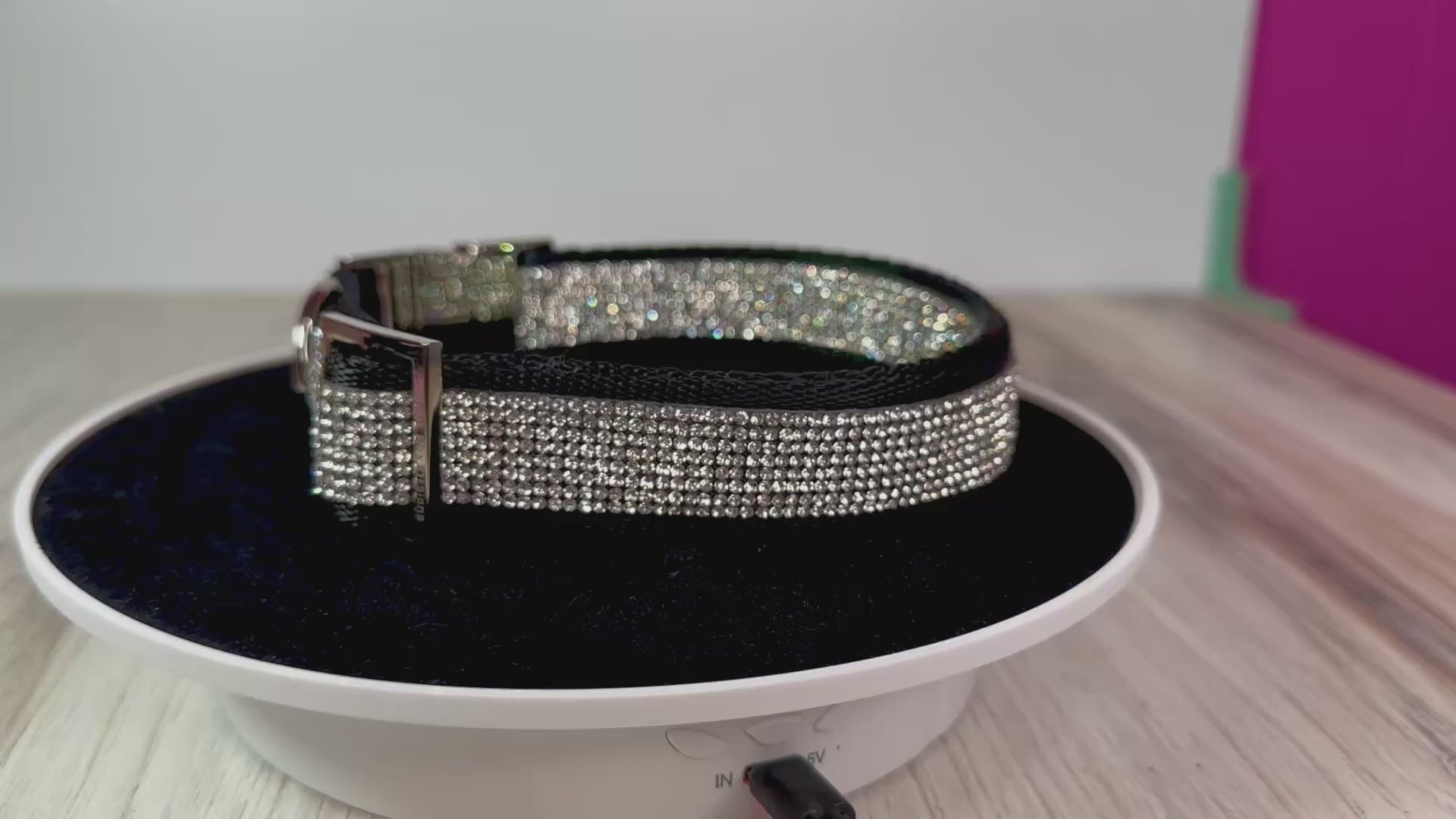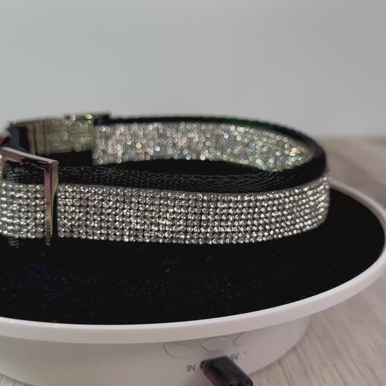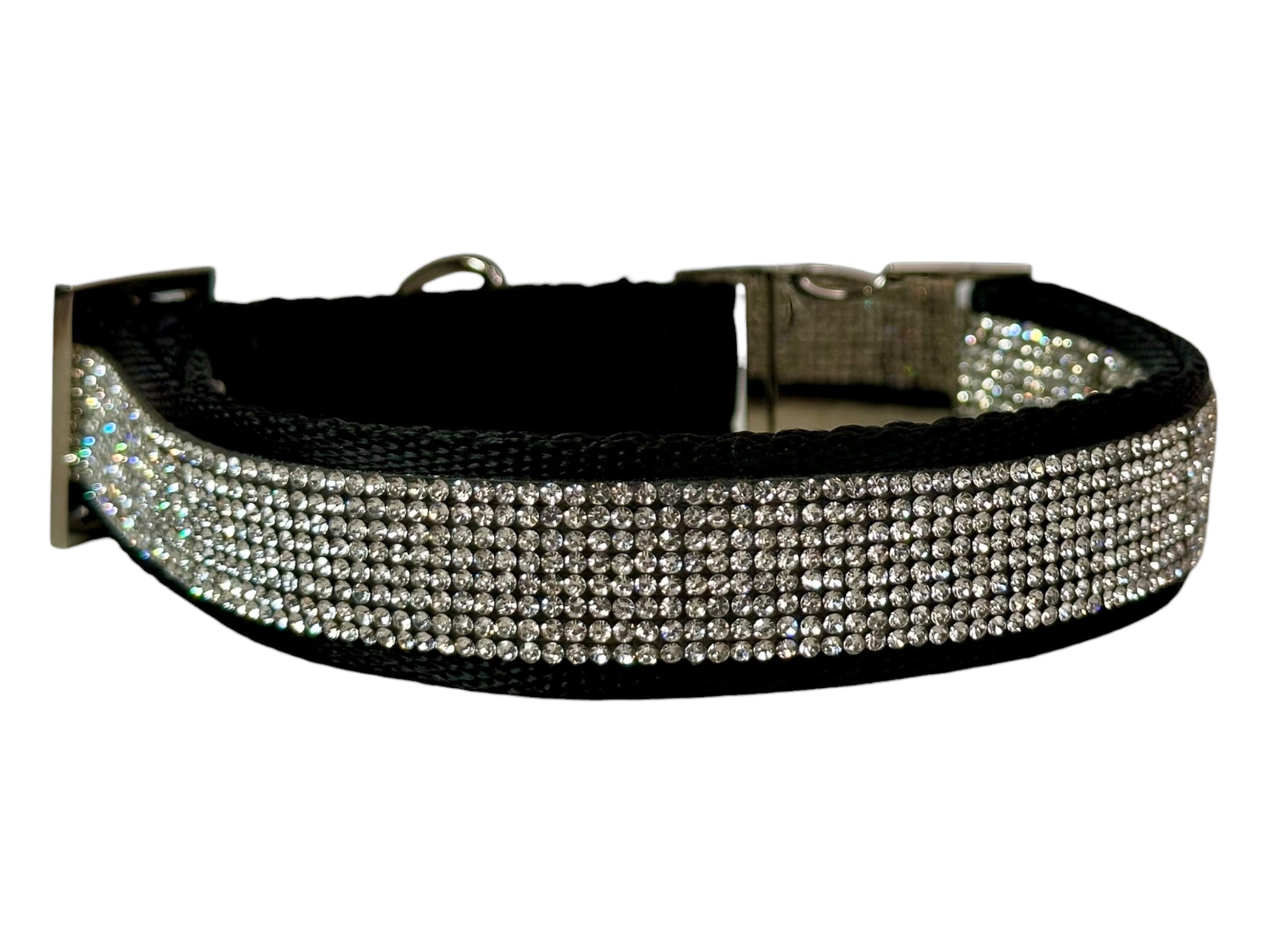 Bring some glamour to your furry friend with our handmade Rhinestone and Webbing Dog collar! The Black webbing, White Rhinestones, and engrave-able silver hardware make it a perfect statement piece. Comfortable and beautiful, it's not meant for dogs that itch or rough house with their collars. Personalization included at no extra cost!