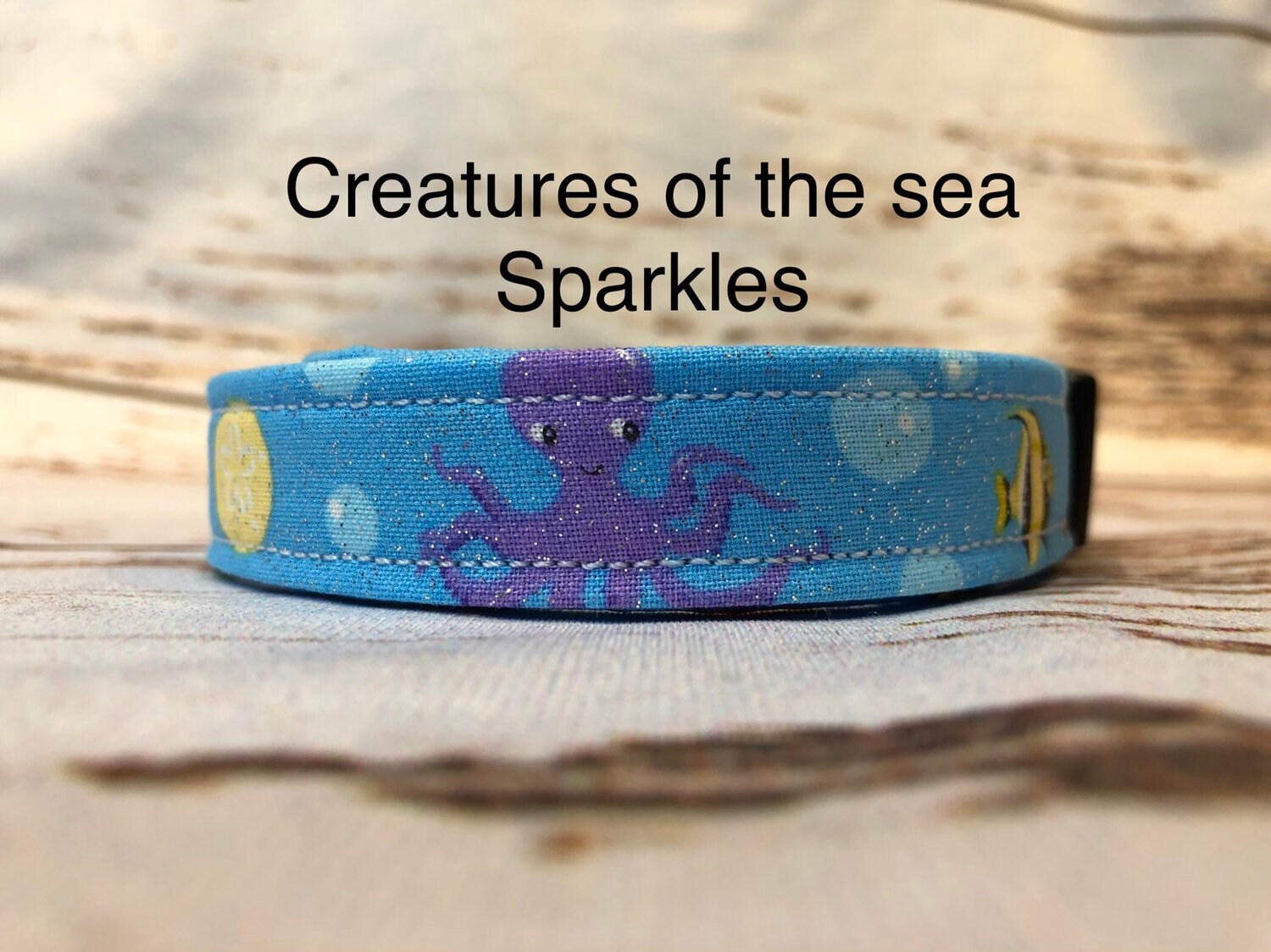Sea creature dog collar, fish dog collar, sparkles, ocean life, adjustable collar, side release collar, washable collar, fabric dog collar