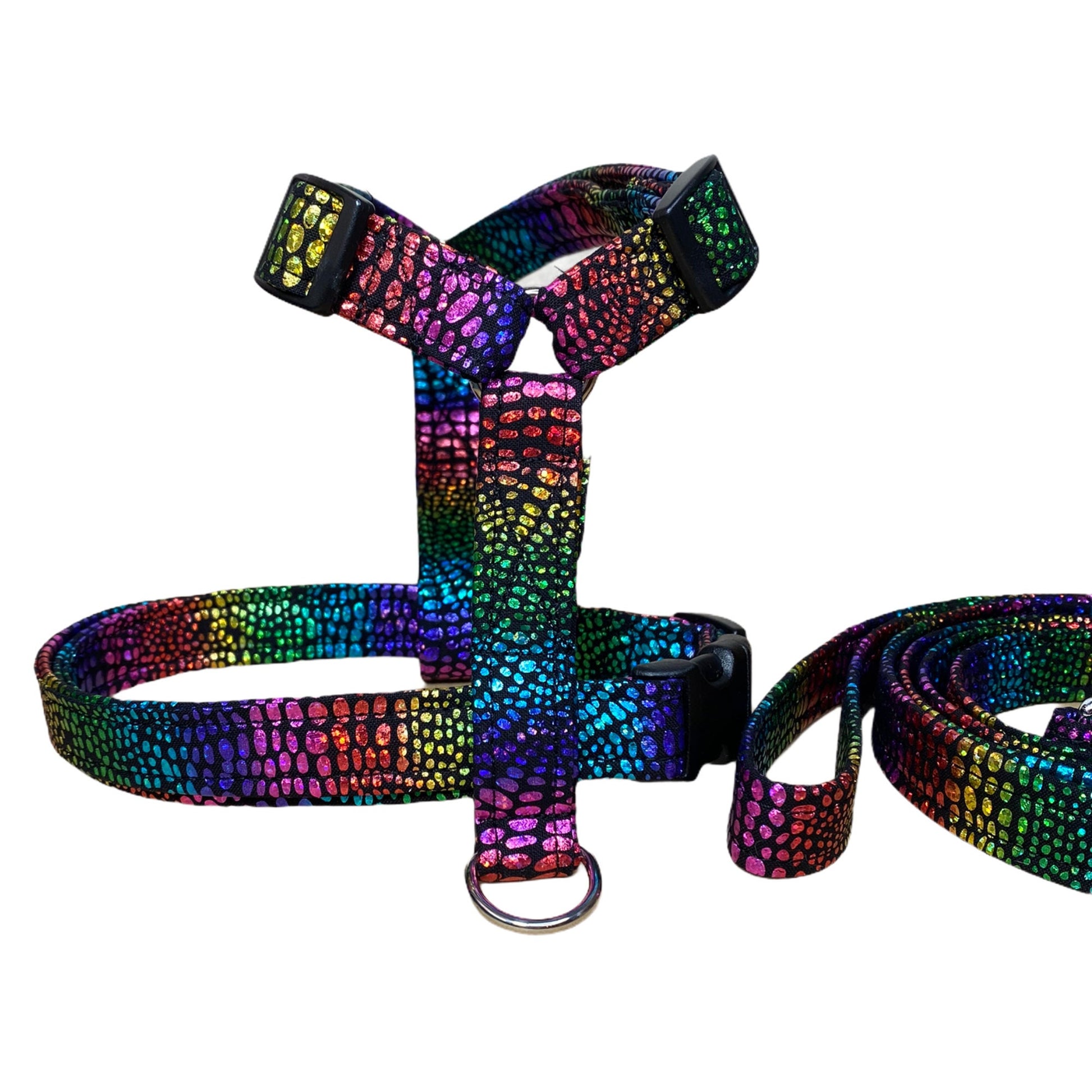 Snake dog harness and leash set, standard Roman harness, step in harness, dog harness, adjustable dog harness, Rainbow, snake skin print