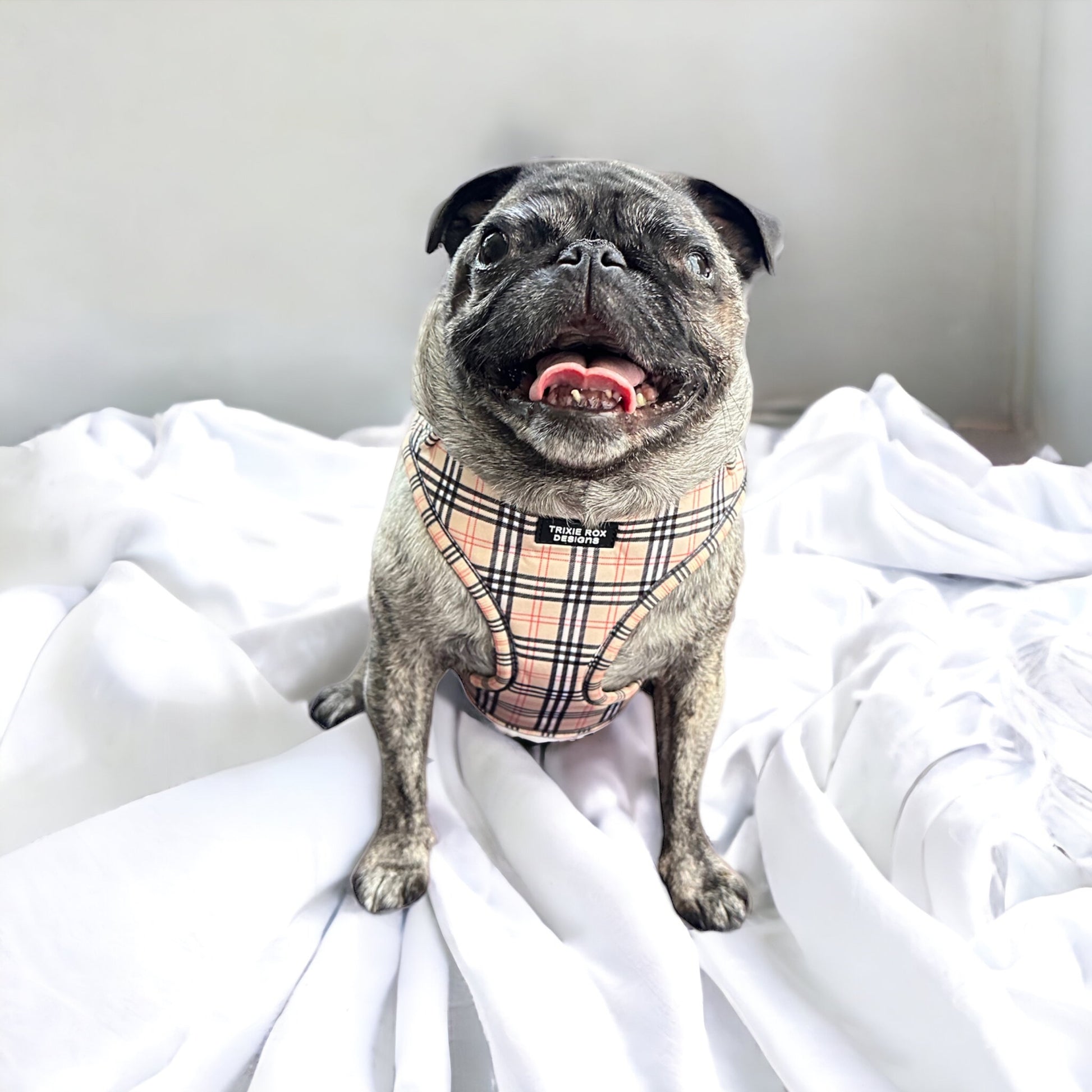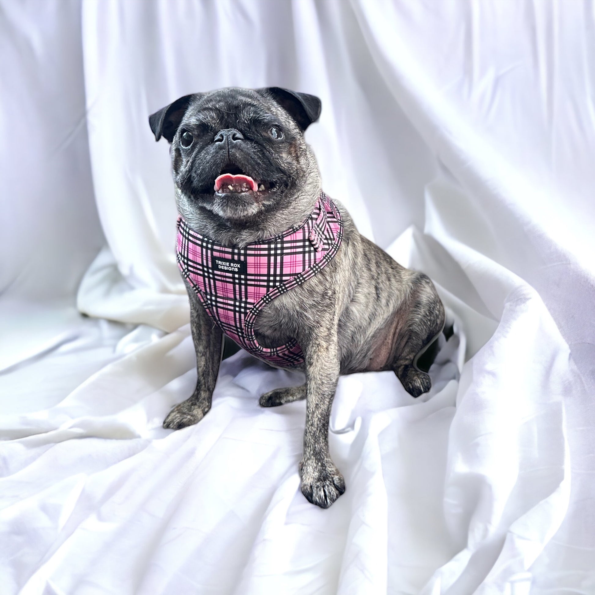 The photo item is an example of how the print will look on the harness, your item may look differently based on the size and style that you choose and where the print will fall.