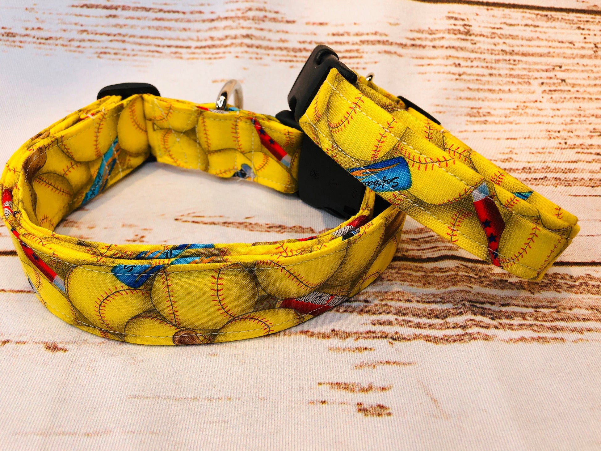 Softball dog collar, yellow, softballs, side release collar, fabric dog collar, adjustable collar, washable, unisex, female, softball team