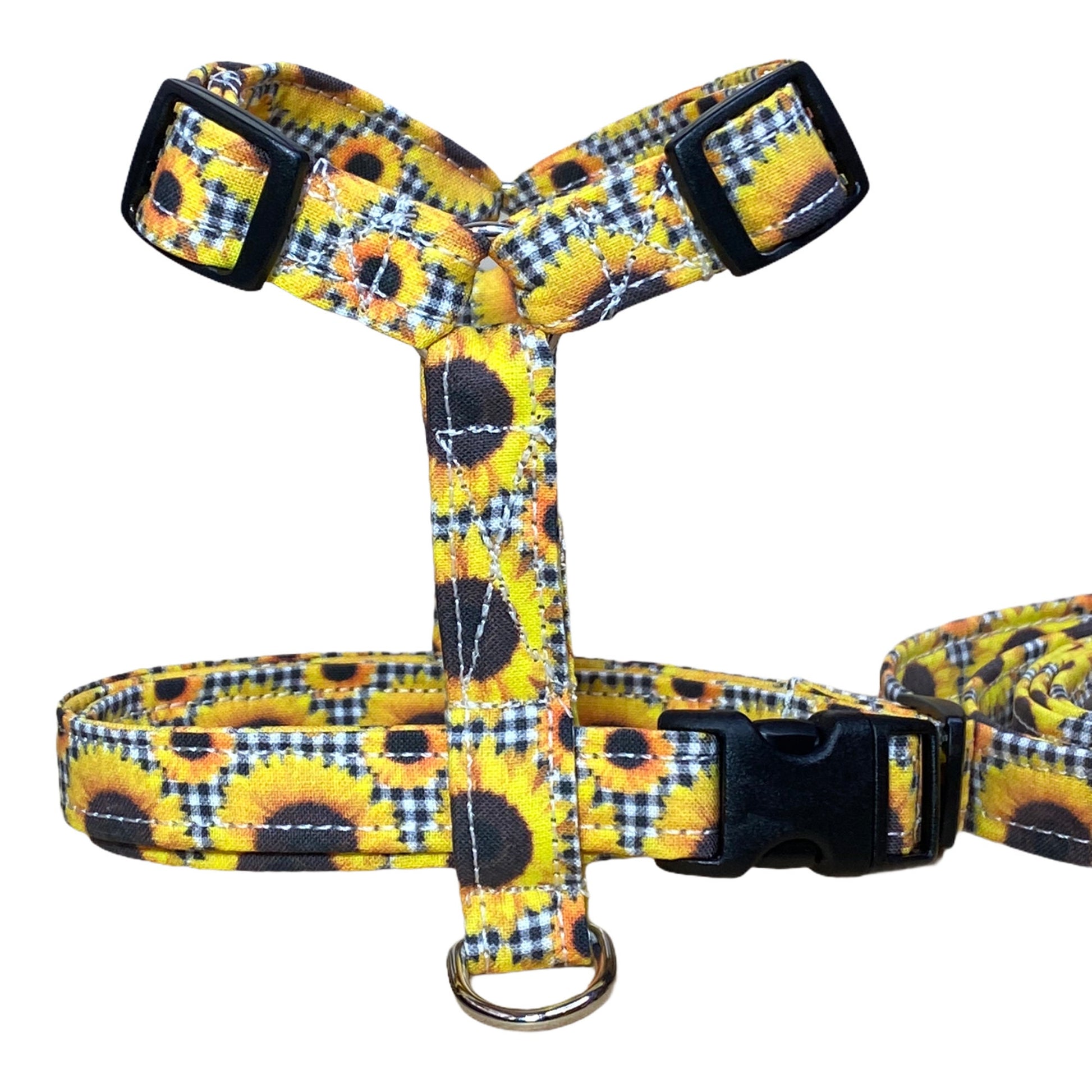 Sunflower and buffalo plaid dog harness and leash set, standard Roman harness, step in harness, adjustable, washable, fabric, sunflower, dog